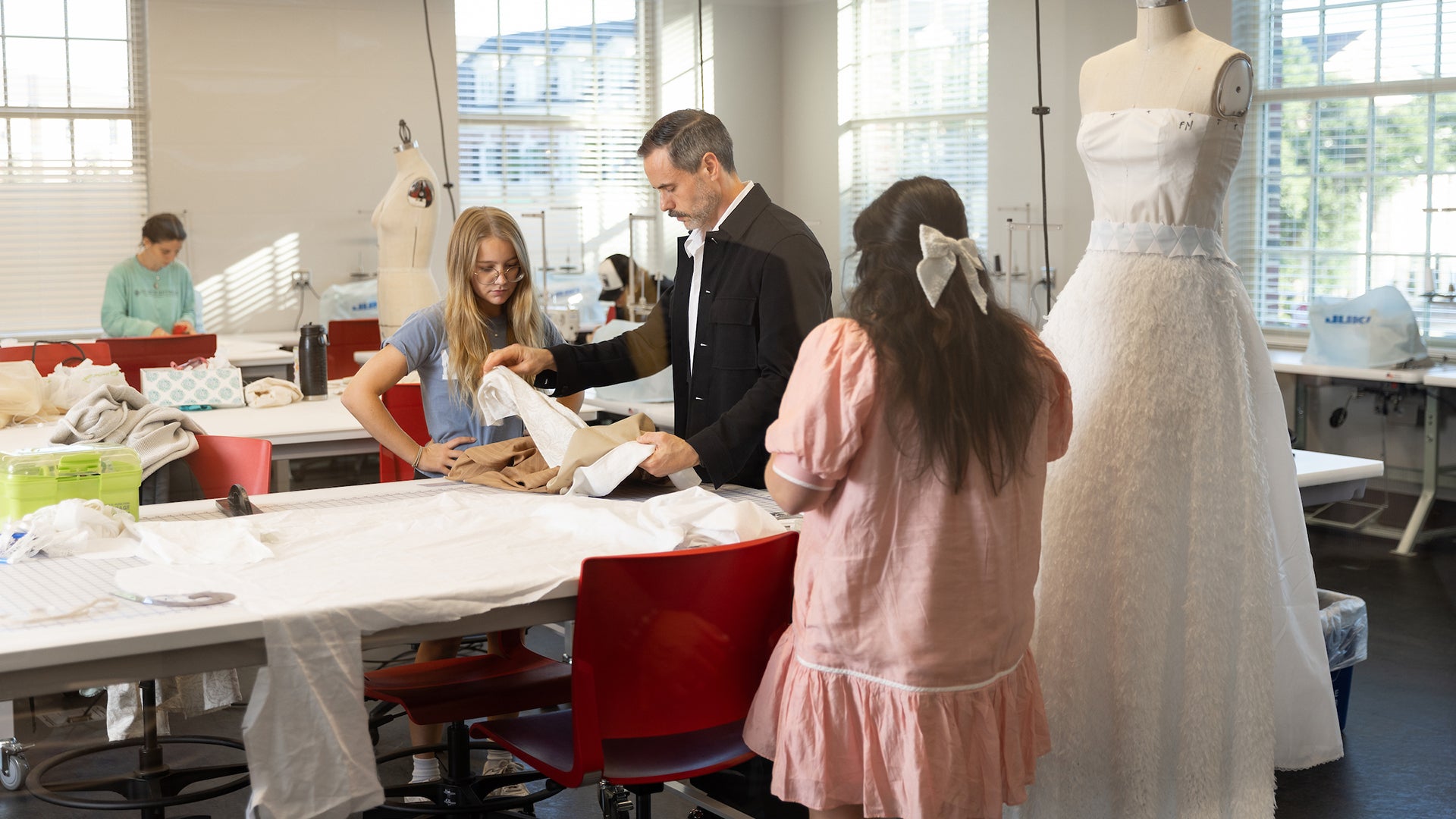 The women move seamlessly from one space to the next, all working toward the same goal: completing their capstone projects for Professor Brian Taylor’s advanced apparel design course at The University of Alabama. His seniors must design and produce a collection based on their respective target philosophies and will spend most of the Fall 2023 semester readying for a fashion show in November, where they’ll debut their designs.